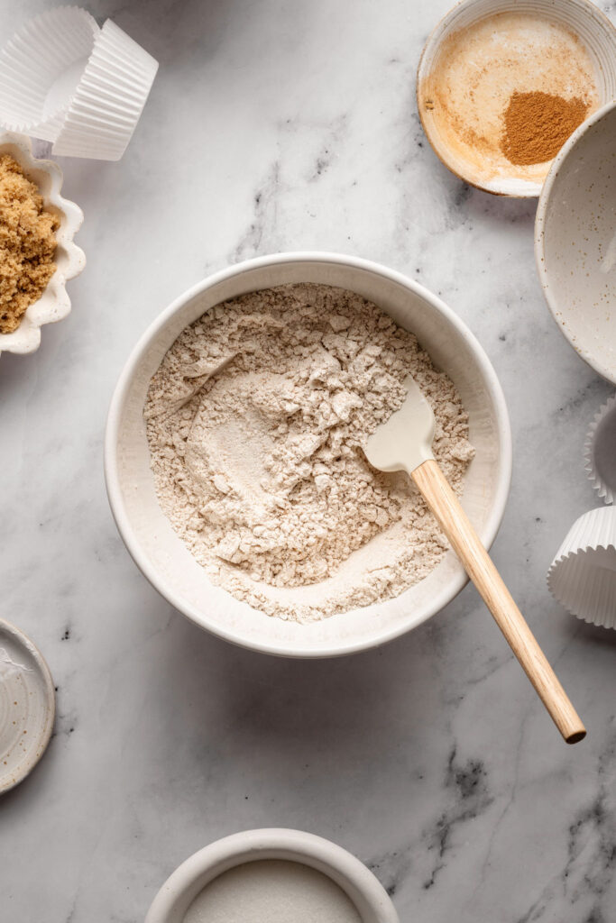 3. In a small mixing bowl, whisk together the gluten free 1:1 flour, baking powder, baking soda, salt, cinnamon, ginger, and nutmeg. Set aside.