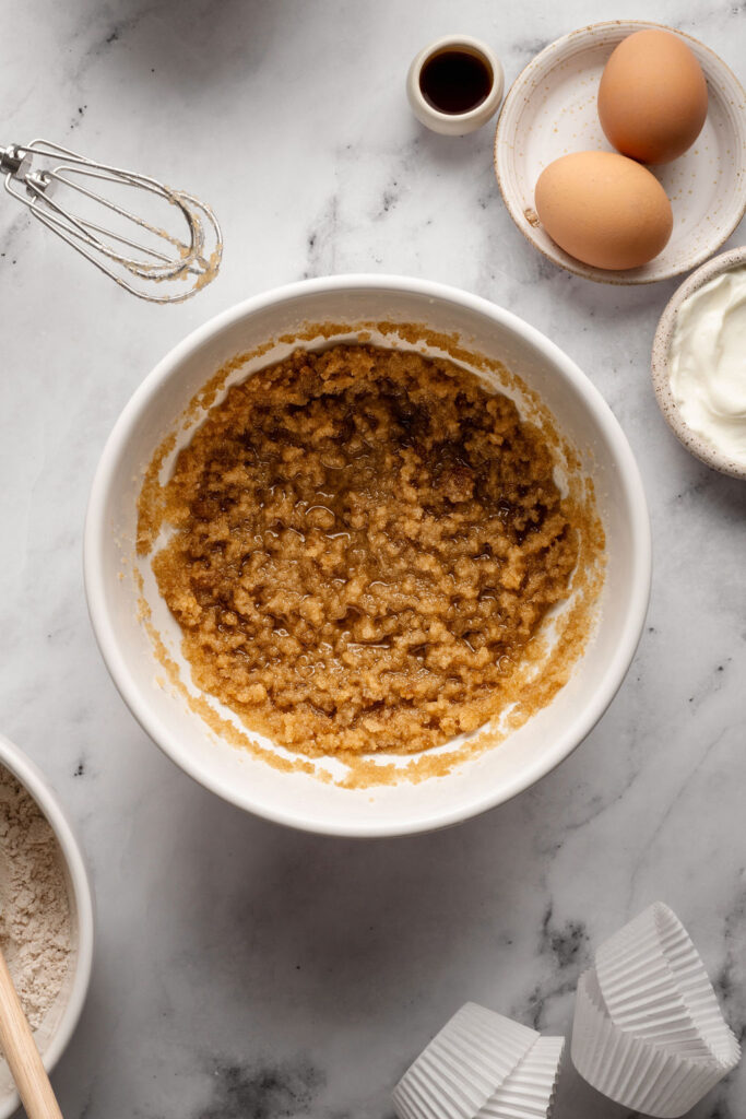 Step 2: Mix together the oil, granulated sugar, and light brown sugar for 1–2 minutes until smooth and well combined.