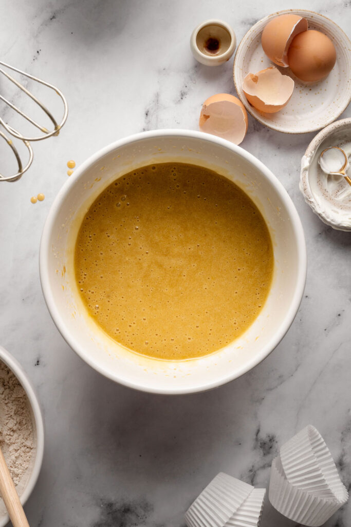 Step 3: Add the eggs and vanilla extract and mix until combined. Then add the sour cream and mix again until fully incorporated.