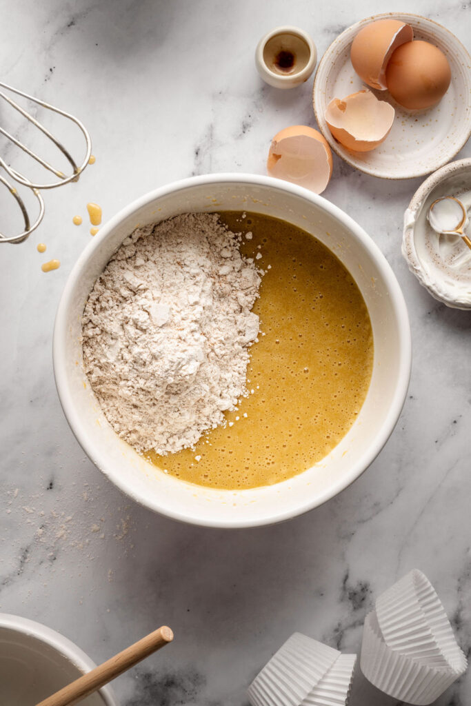 Step 4: Add the dry ingredients to the bowl of wet ingredients and mix on low until no flour streaks remain.