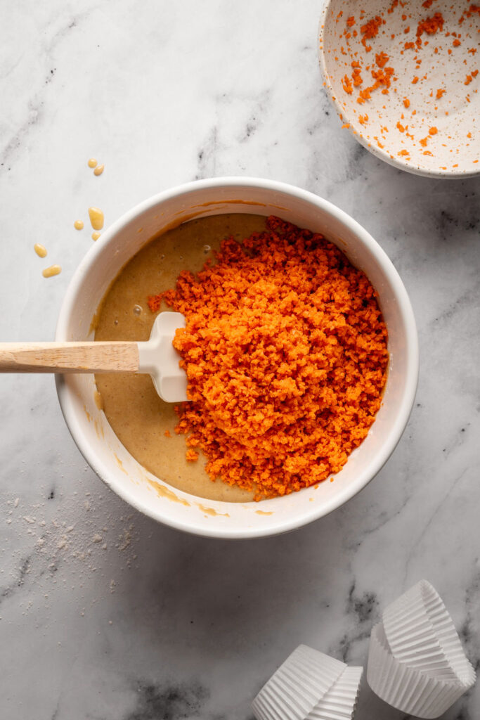 Step 5: Fold in the grated carrots until they are evenly distributed throughout the batter.