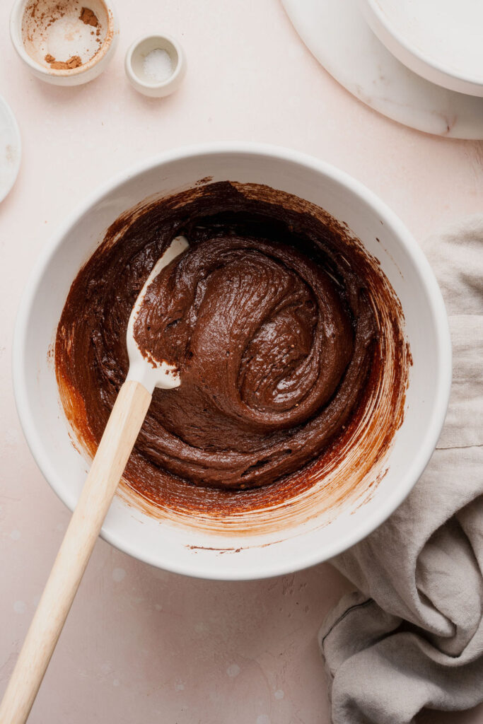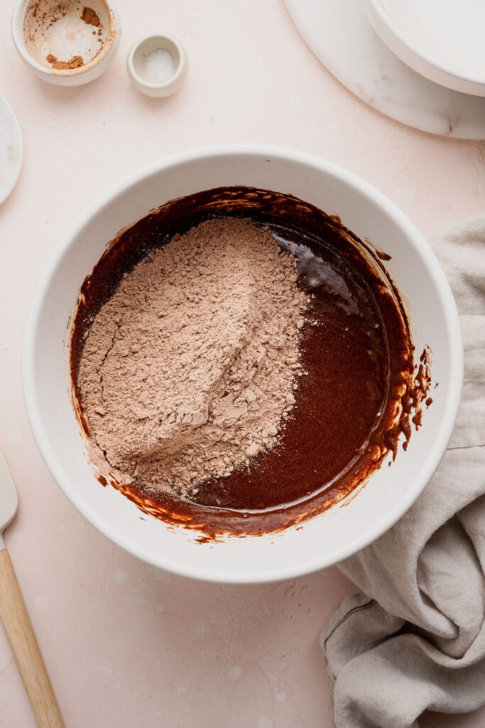 Step 5: Whisk together the gluten-free 1:1 flour, cocoa powder, and salt and add to the bowl with the wet ingredients.