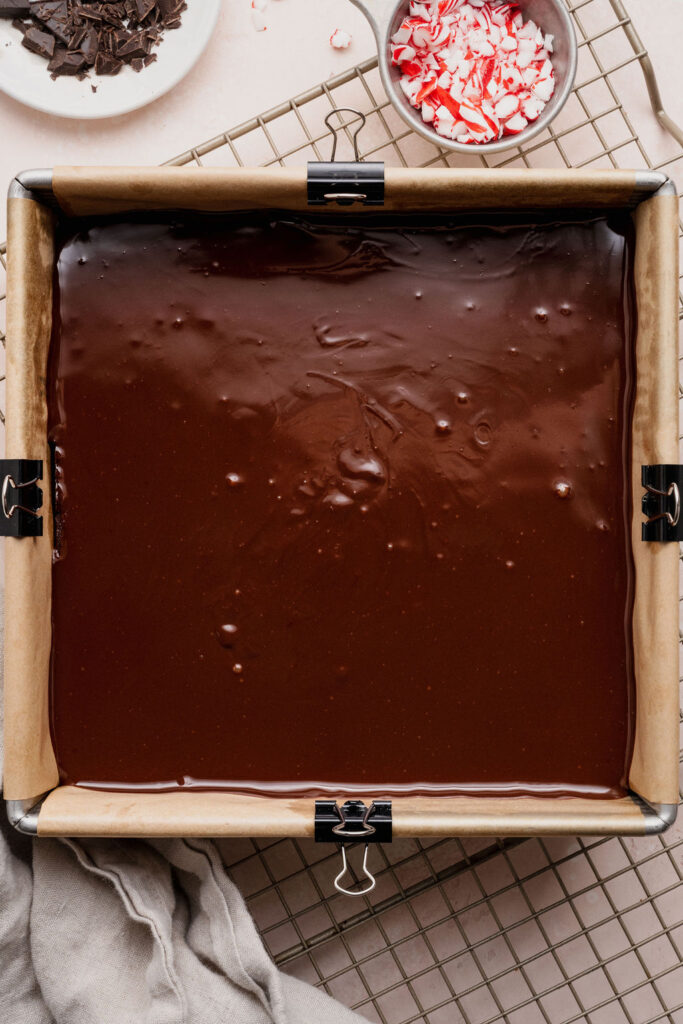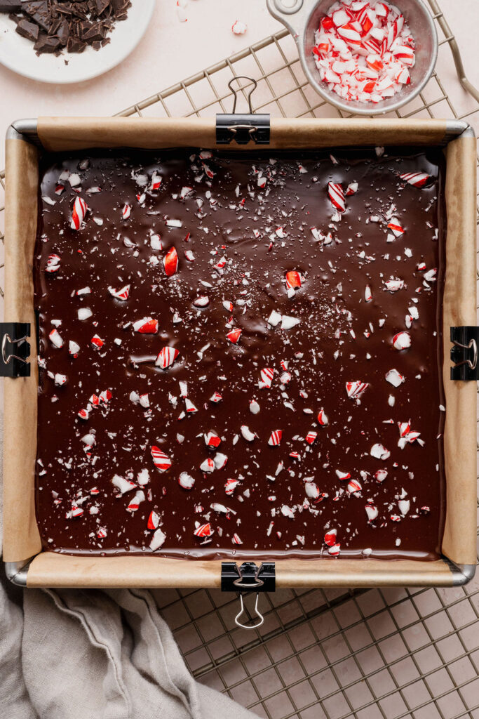 To prevent the peppermint pieces from sinking, allow the ganache to thicken slightly before adding the topping. Let it rest for 5–10 minutes (or chill the pan briefly for about 5 minutes) until the surface begins to set. Sprinkle finely crushed peppermint first, then larger pieces—this helps them stay suspended and keeps the topping crisp and beautiful.