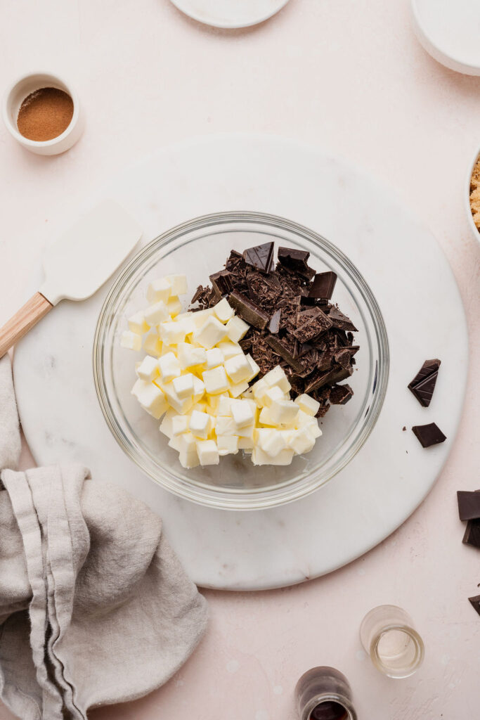 Step 1: Add the cubed butter and chocolate to a heat safe bowl and melt on the stove over a double boiler.