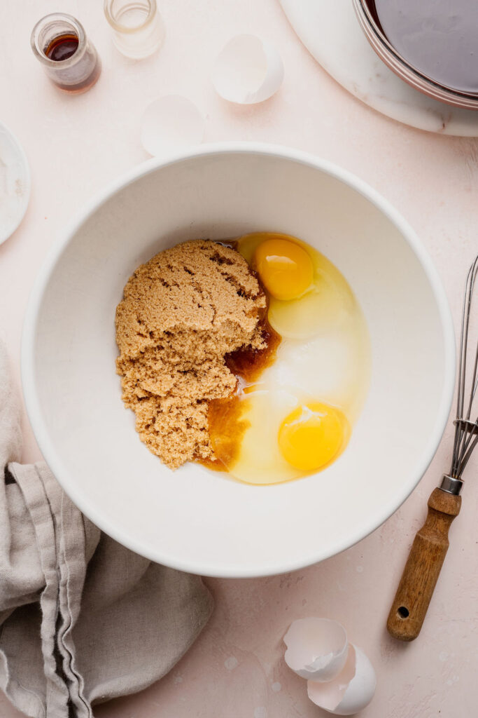 - Add the eggs, light brown sugar, and granulated sugar to a large mixing bowl and vigorously whisk together for ~ 2 minutes until the mixture appears pale and creamy.