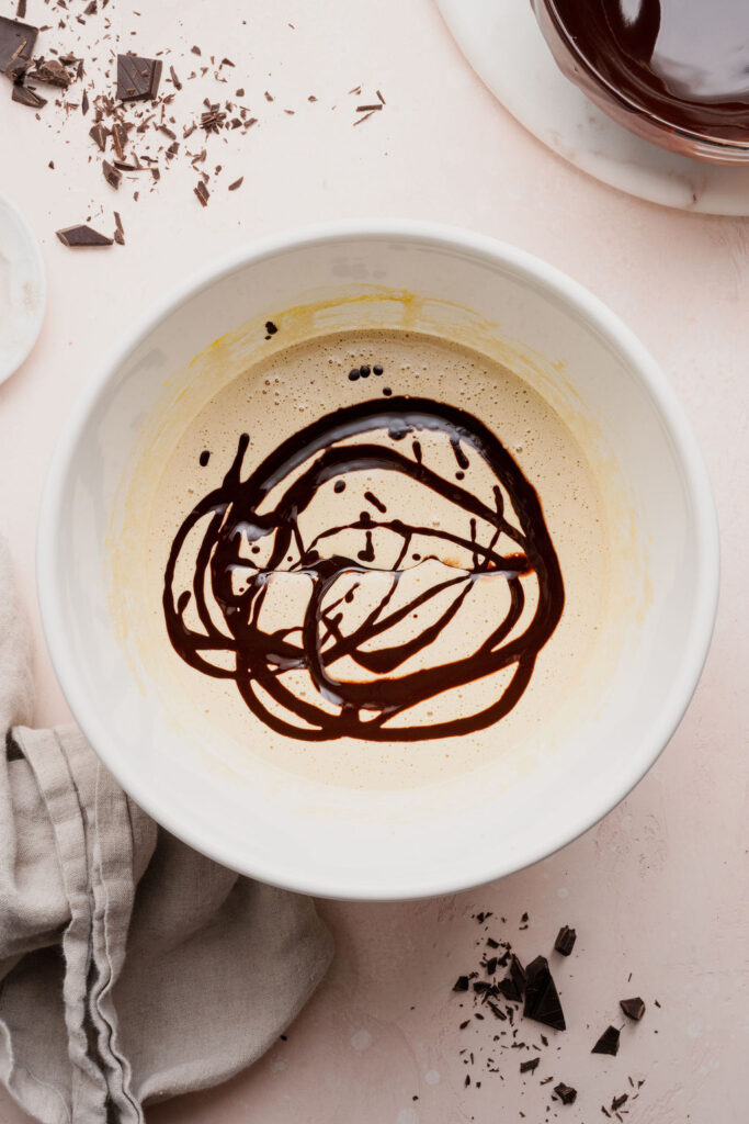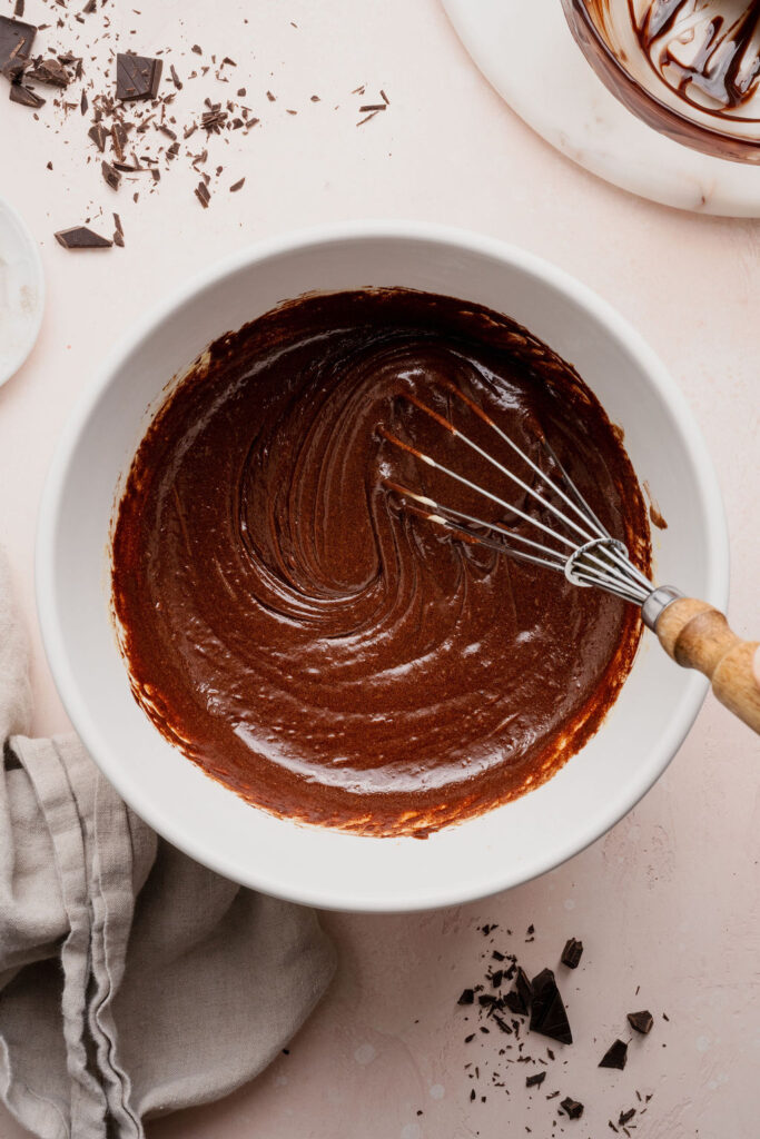 - Pour the chocolate and butter mixture into the bowl and whisk until combined.