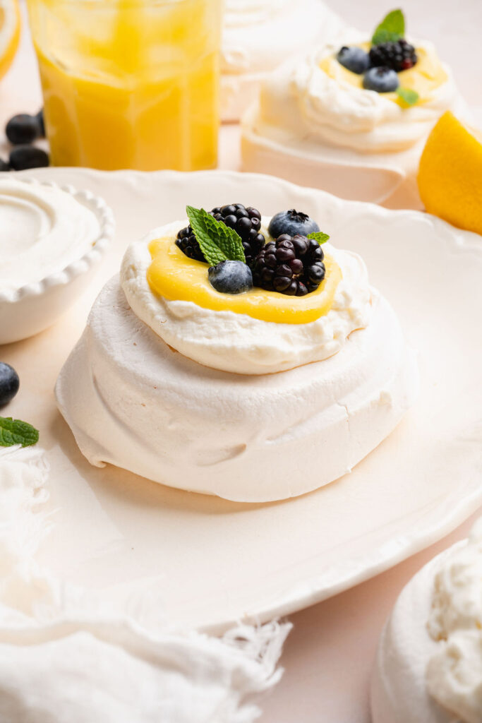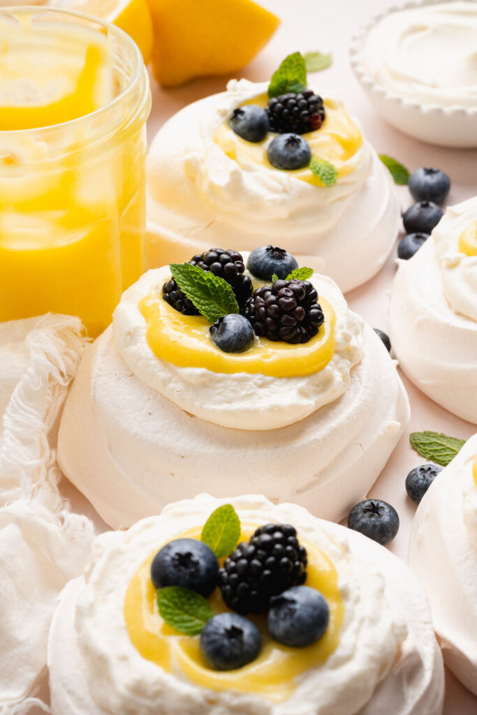 Blueberries and blackberries add freshness, color, and a slight tartness that balances the sweetness of the pavlovas.