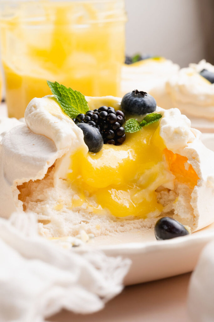 Adds brightness and a vibrant citrus note that balances the sweetness of the pavlovas. Homemade lemon curd offers the best flavor and texture and is a great way to use up the leftover egg yolks, but a high-quality store-bought option works well for convenience.
