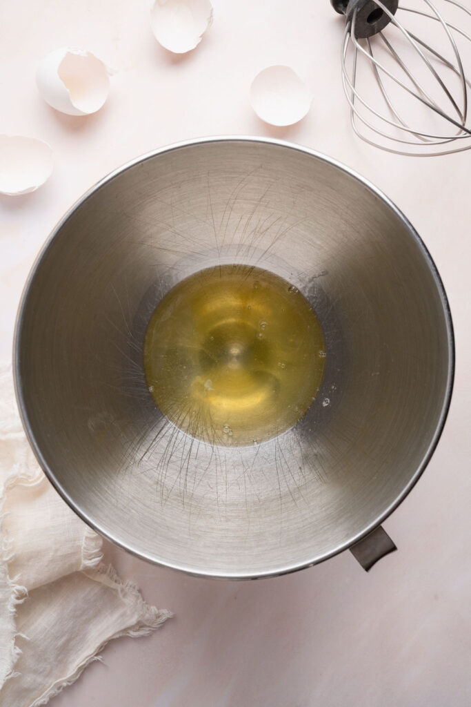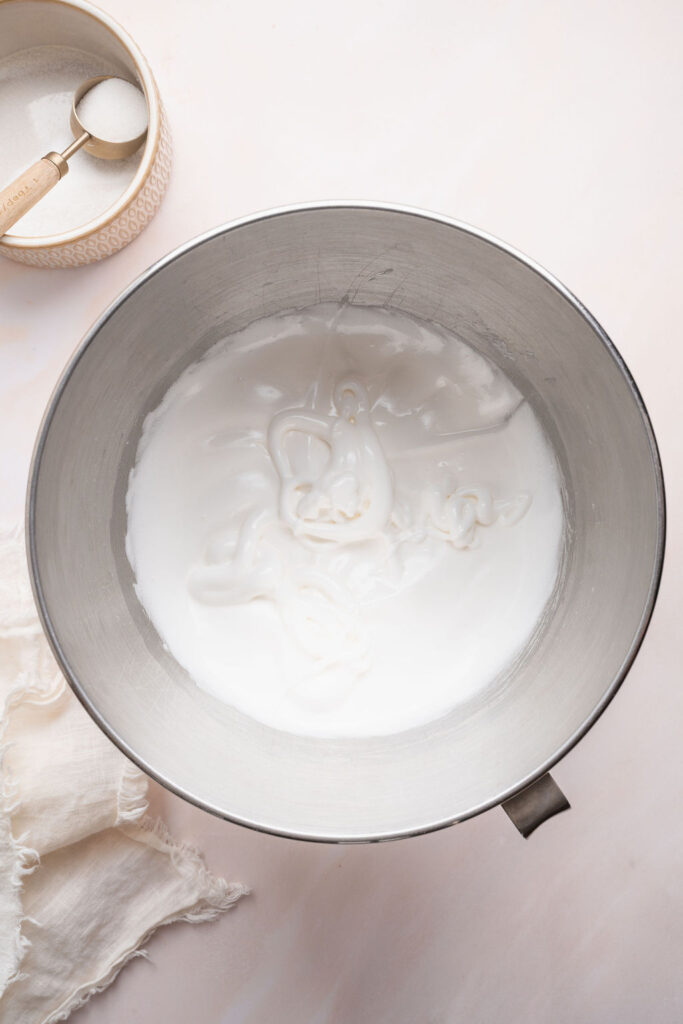 1. Place the room temperature egg whites and a pinch of salt in the bowl of a stand mixer fitted with the whisk attachment (use a clean glass or metal bowl).