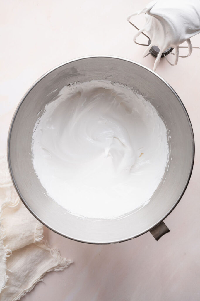 Step 3: Increase the speed to medium-high and whip until stiff, glossy peaks form and the meringue is smooth and no longer grainy, about 8–10 minutes.