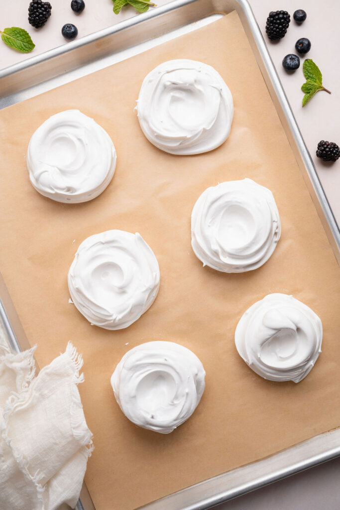 Step 5: Pipe the meringue onto a parchment-lined baking sheet into six 3-inch mounds. Use the back of a spoon to create a small indentation in the center and gently shape the edges.