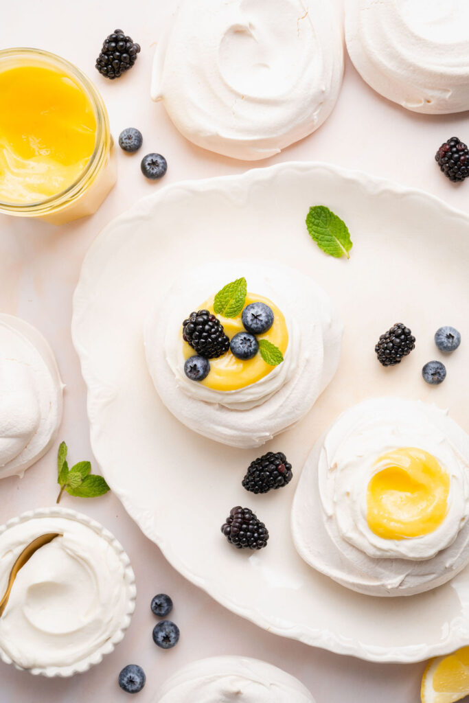 1. If using homemade lemon curd, prepare it in advance so it has time to chill and fully set before assembling the pavlovas.