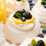 Crisp meringue, softly whipped mascarpone, and bright lemon curd come together in these delicate mini pavlovas. Each one is layered with texture and flavor—from the light, crisp shell to the soft, marshmallow-like center—then finished with a generous spoonful of mascarpone cream and a handful of fresh berries.