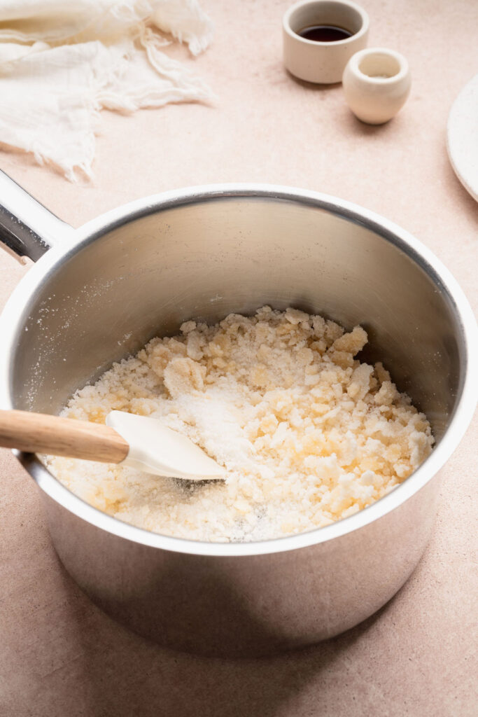 Step 1: Add the granulated sugar to a medium stainless steel saucepan and place it over medium heat. Stir occasionally with a heat-safe rubber spatula as the sugar begins to warm and clump. Once clumps form, stir constantly until the sugar starts to melt.