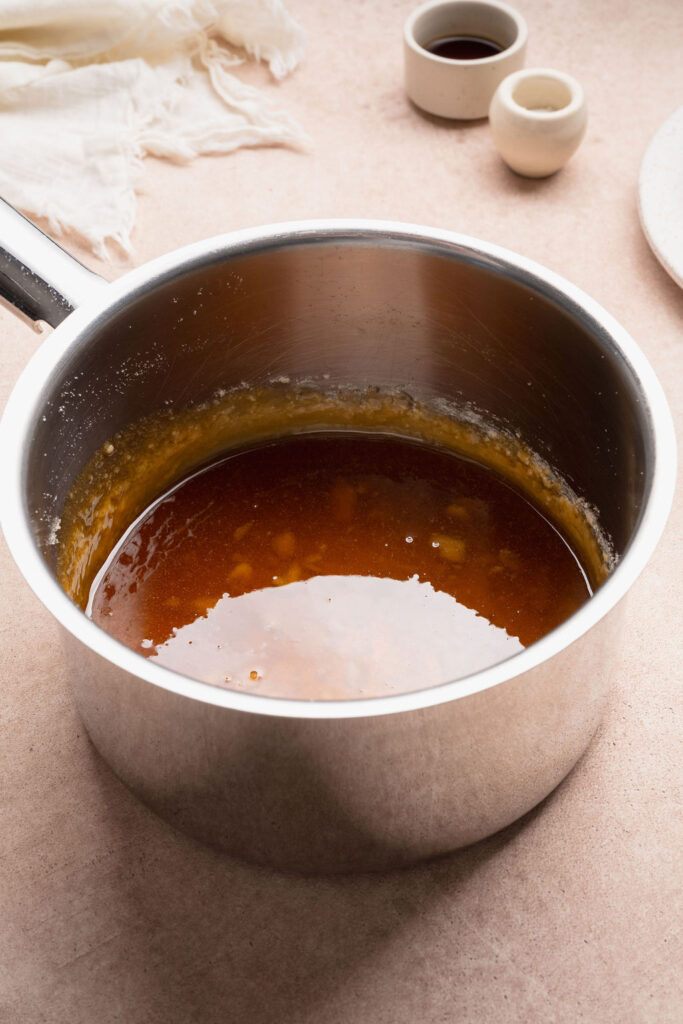 Step 6: Whisk in the vanilla extract and salt until fully combined. Let the caramel cool in the saucepan for a few minutes, then transfer to a heat-safe jar or container. Allow it to cool to room temperature, where it will thicken into a rich, pourable sauce.
