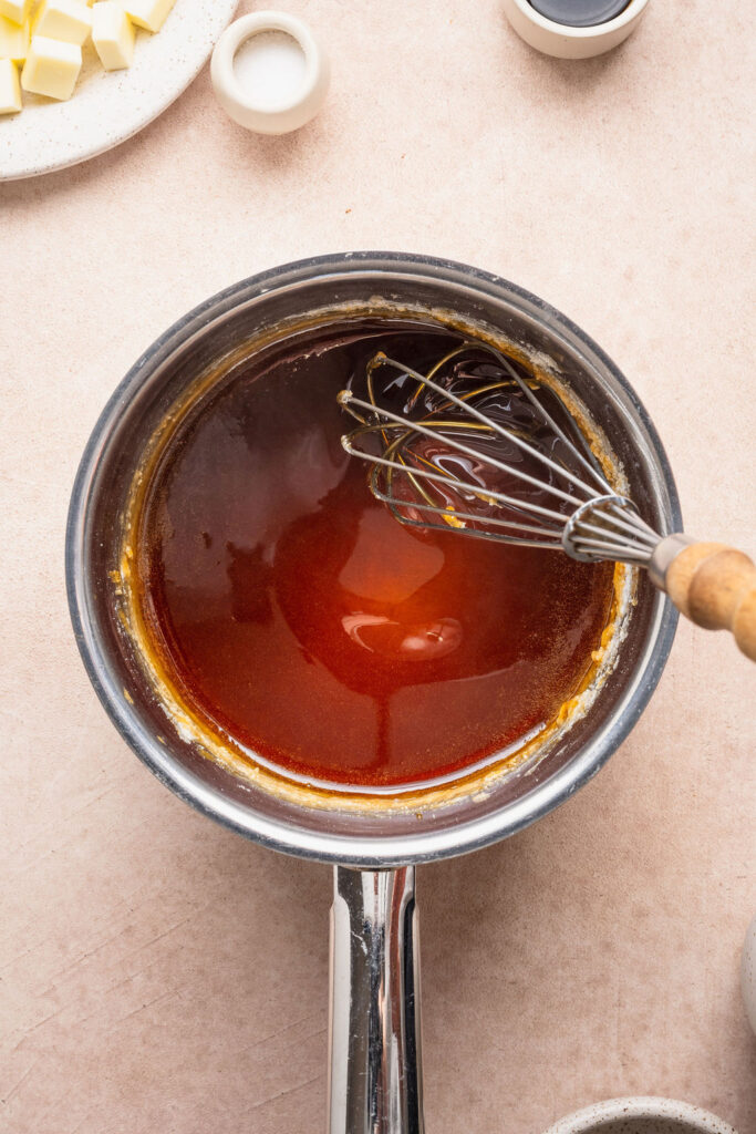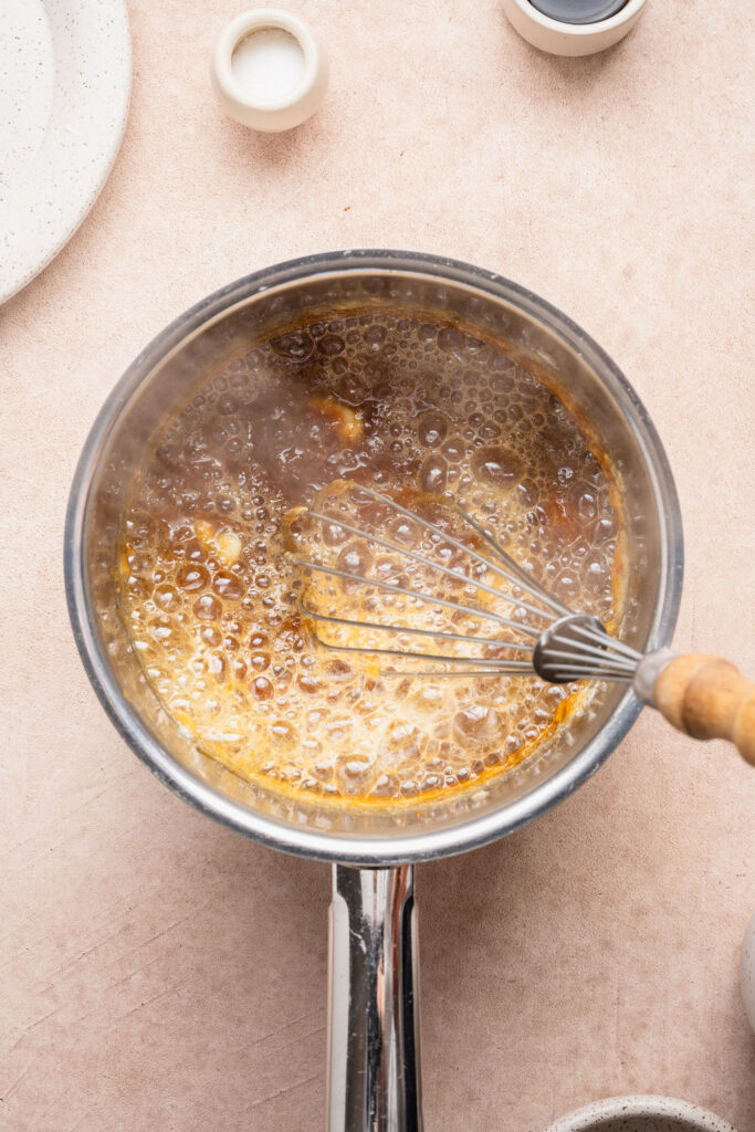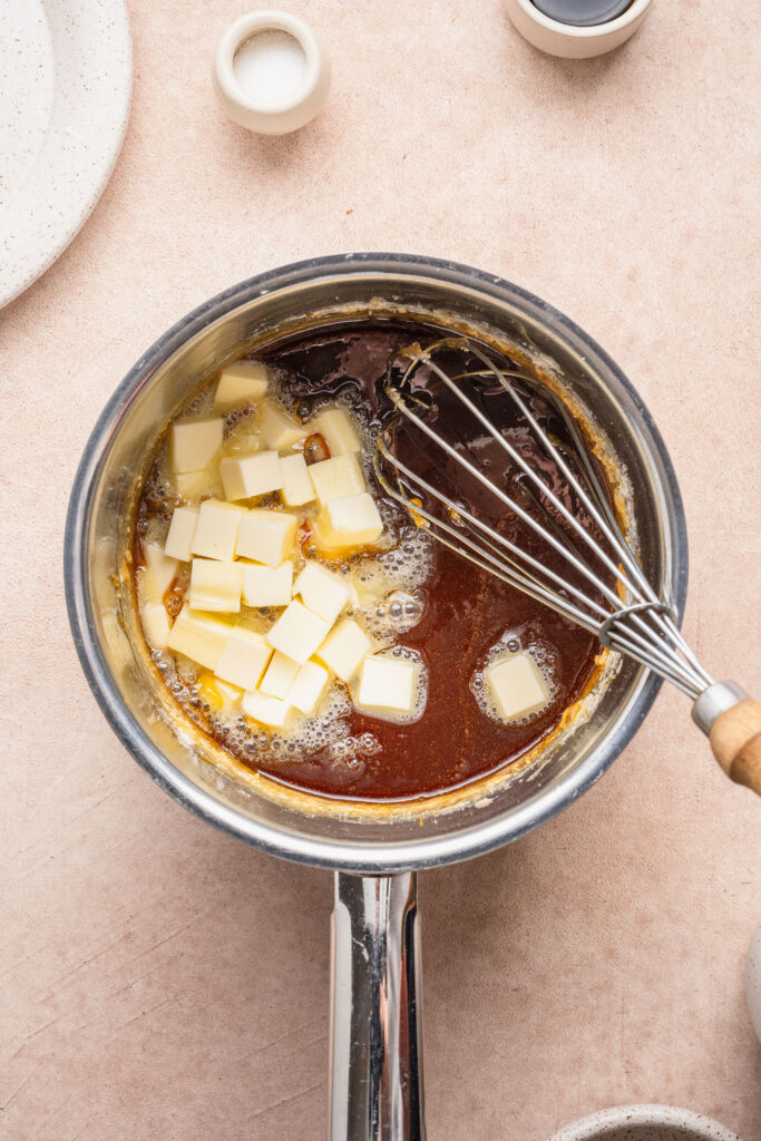 2. Remove the saucepan from the heat and carefully add the cubed butter. Whisk until the butter is fully melted and incorporated, about 30 seconds. The mixture will bubble vigorously, so use caution.