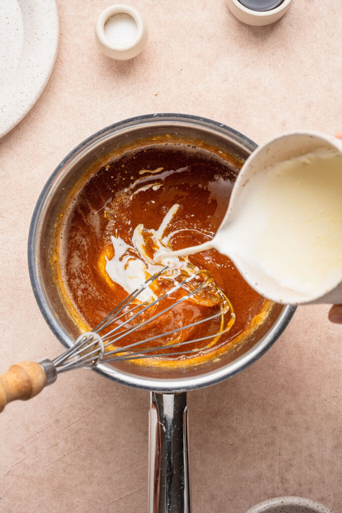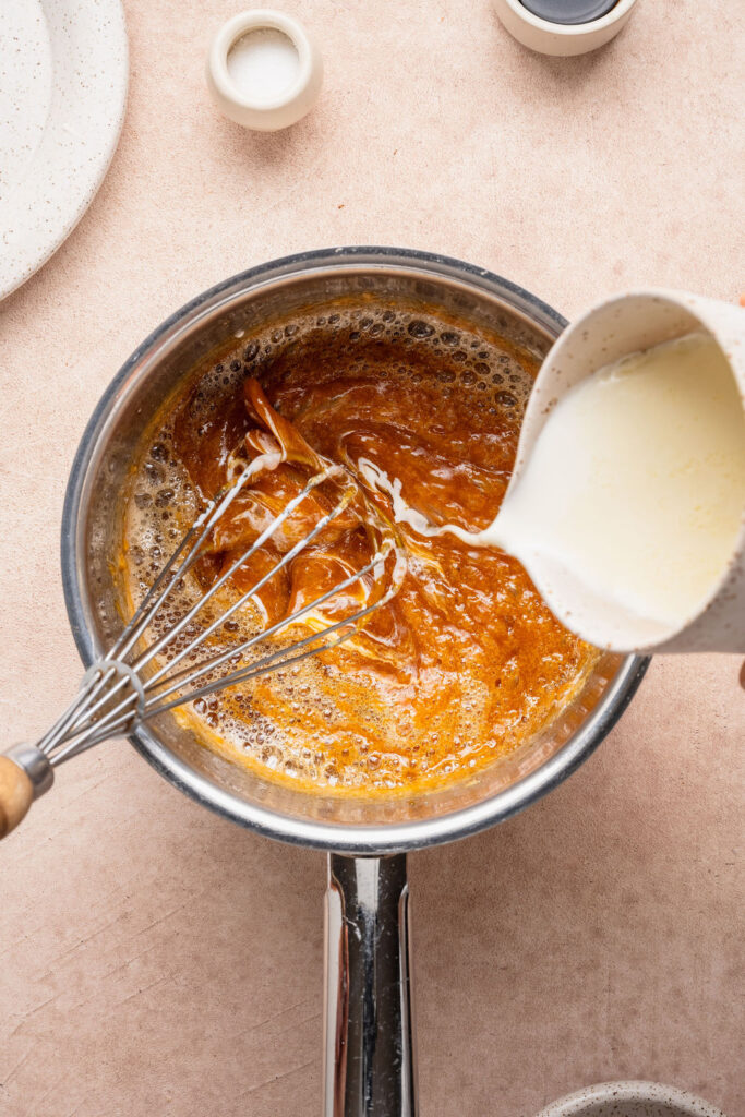 Step 5: Slowly pour in the warm heavy cream while whisking constantly. The caramel will bubble and steam again but will quickly become smooth and silky.